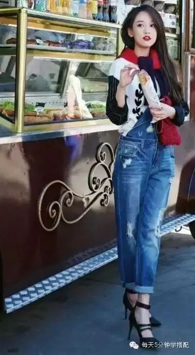 黑白色上衣搭配破洞的背带牛仔裤,将一边背带自然的垂下来,很显随性时髦范。