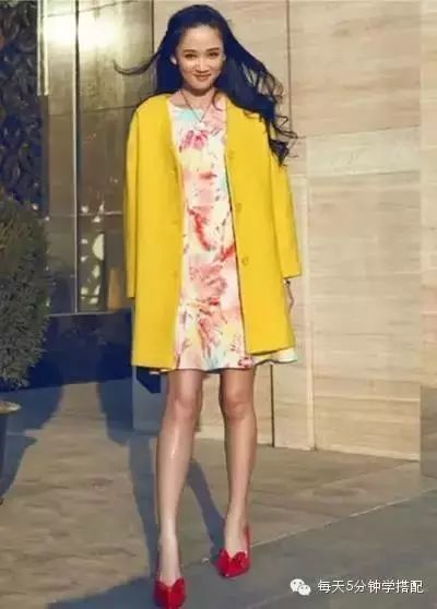黄色大衣内搭印花裙,颜色非常抢眼,脚踩一双蝴蝶结高跟鞋,红色与黄色搭配, 特别亮眼的颜色,显得特别有青春活力。