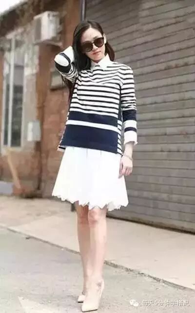 条纹衫搭配半身裙,非常有女人味,搭配一双高跟鞋,凸显纤细腿部线条,性感极了。