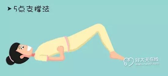 ❷ 5点支撑法:平卧于硬板床上,用头,双脚,双肘5点支撑,将臀部抬起,臀部尽量抬高。保持10秒,重复20次/组,2-3组/天。