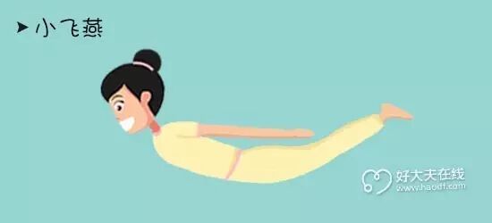 ❸ 小飞燕:俯卧与硬板床上,头,双上肢,双下肢后伸,腹部接触床的面积尽量小,呈飞燕状。保持5-10秒,重复20次/组,2-3组/天。