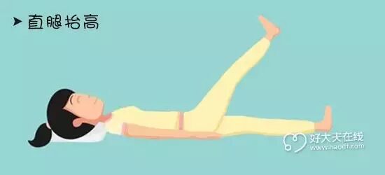 ❶ 直腿抬高:仰躺在床上,腿伸直,两手放在体侧,一条腿缓慢抬起,慢慢增加腿抬高角度,两腿交替进行。每组10-20下。