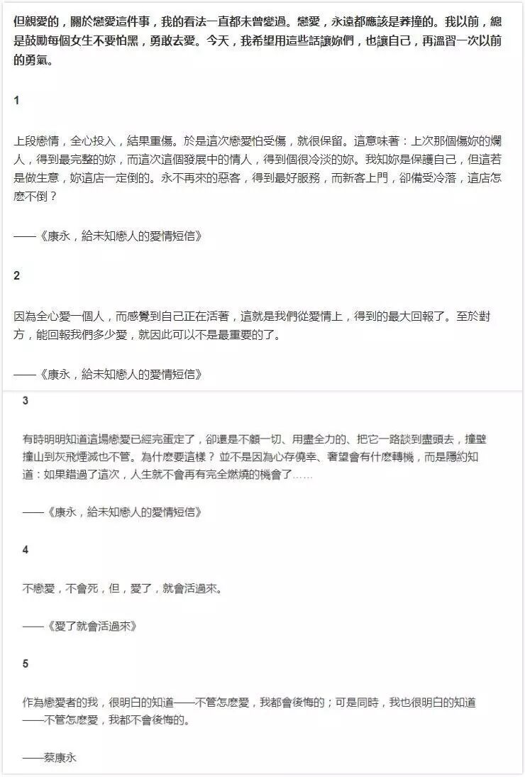 在此附上蔡康永的微博长文节选,无论你是在追爱路上,还是已经拥有爱情,他的暖,都会让你更加勇敢: