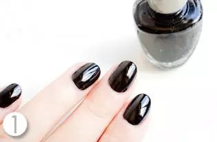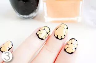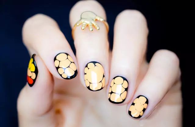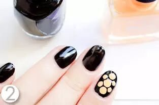 Step 2:待黑色指甲油半干的时候点上几个大小不同的橙色圆点,橙色的点可以厚一些,这样能让圆点向外散开,在黑色半干的时候点上橙色指甲油可以让橙色指甲油散开的时候不会黏在一起。