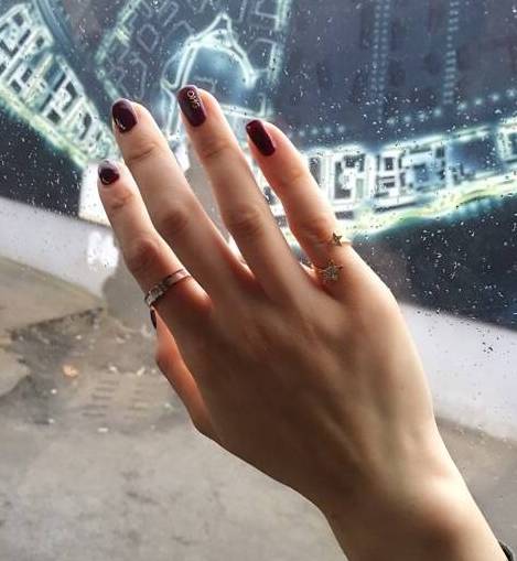 除了大颗宝石外,蒋欣也极喜欢多个戒指叠搭,酒红的美甲搭配食指的珍珠母贝戒指和碎钻星星款式尾戒,显得美艳、成熟、又时尚摩登。