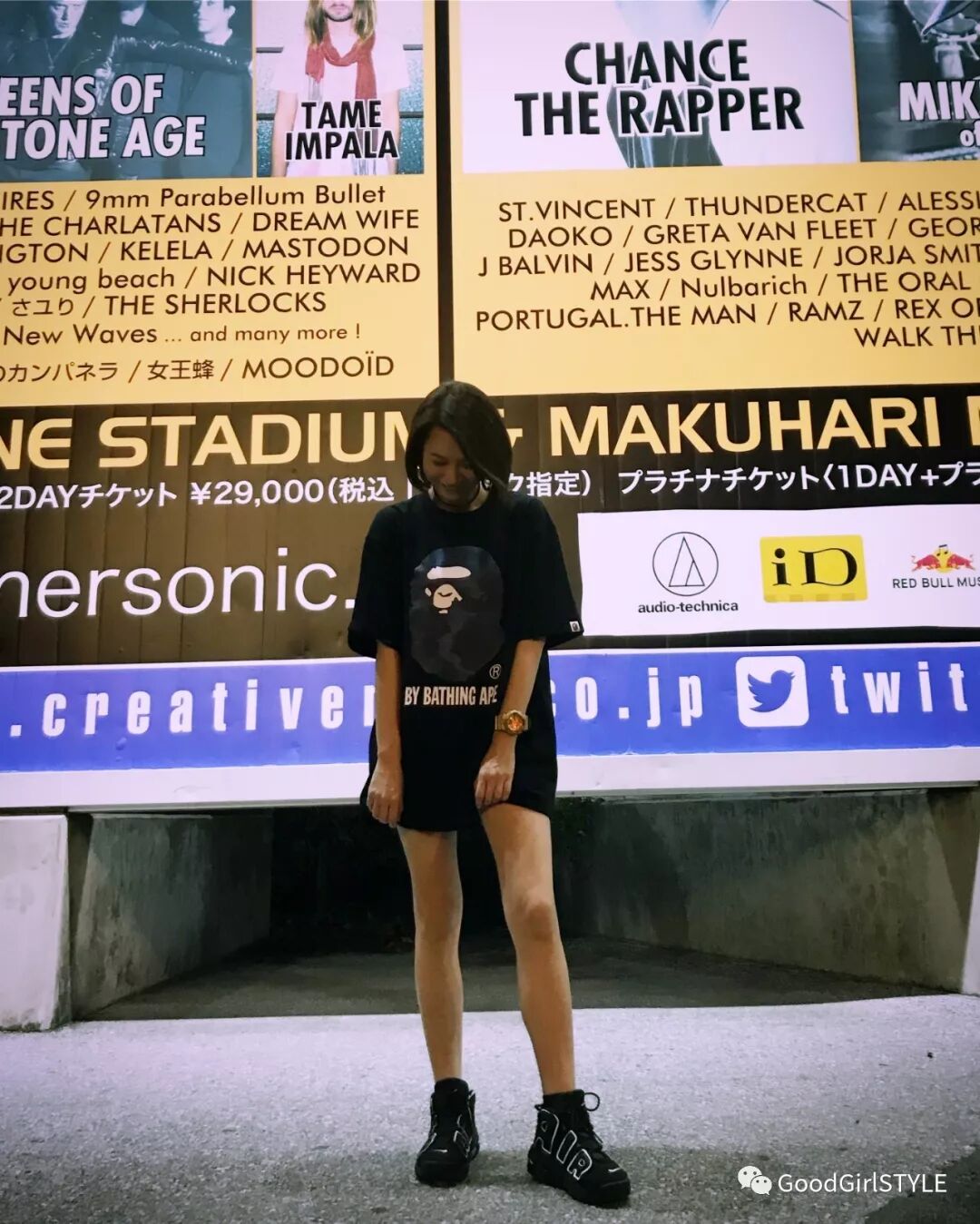 这位腿很漂亮的姐姐一身潮牌加持,还能保持温柔的感觉,实在太难得。身着A BATHING APE oversizeT恤,脚踩NIKE Air More uptempo,正是时下最hit的老爹鞋。all black的简单造型里,手腕上的亮色G-SHOCK运动表让整体更有看点。搭配的迷你长度下装大大减轻了鞋子带来的厚重感,想要尝试老爹鞋款的仙女可以学习哦。