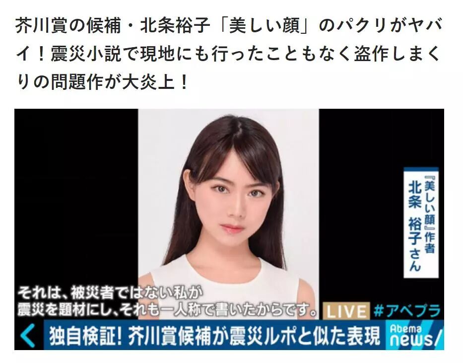 《美颜》被指责作者本人根本没去过受灾区,那些真实的描写部分都抄袭自东日本大地震现场报道记者石井光的采访记录《遗体》。讲谈社出面道歉表示疏忽遗漏标记了“参考文献”,北条裕子本人也发表了没有写明“参考文献”的道歉申明,但都表示并不存在“抄袭”一说。有评论表示,“抄袭”的定义本来就很难判断,不应该以“涉嫌抄袭”来否定文学本身的价值。
