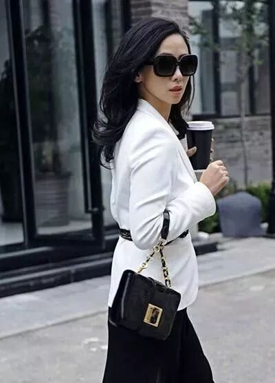 白色西装上衣,深V的领型分分钟打造小脸,黑色的腰带一改西装款式的设计,搭配黑色阔腿裤,显瘦的同时显示出强大气场。随意搭配一款同色系单肩包,毫无违和感,简单的黑白配色,简约又不失气质,女王范儿十足。