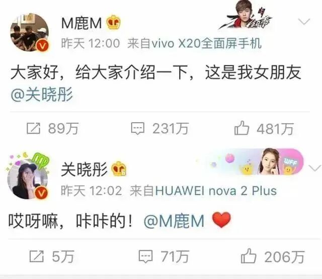 2017年10月8日中午12点整,鹿晗突然在微博宣布与关晓彤的恋情,舆论迅速引爆。