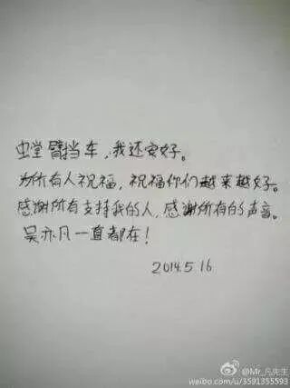 接着就在微博发布了“螳臂当车,我还安好”的笔写声明,正式宣告退团。