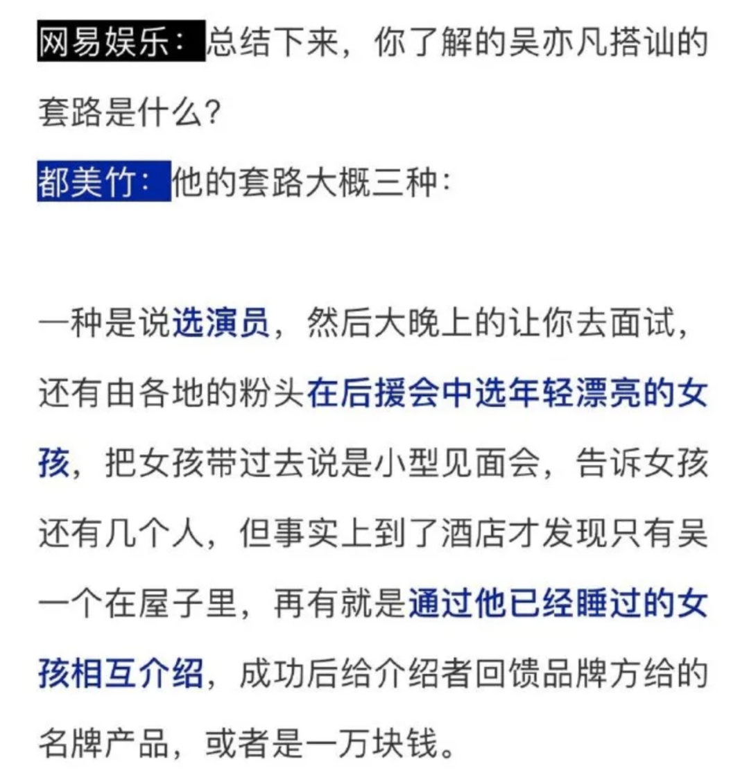 随后,都美竹更是直接发布多条微博,爆料吴亦凡以各种方式物色、诱骗年轻女性发生关系。