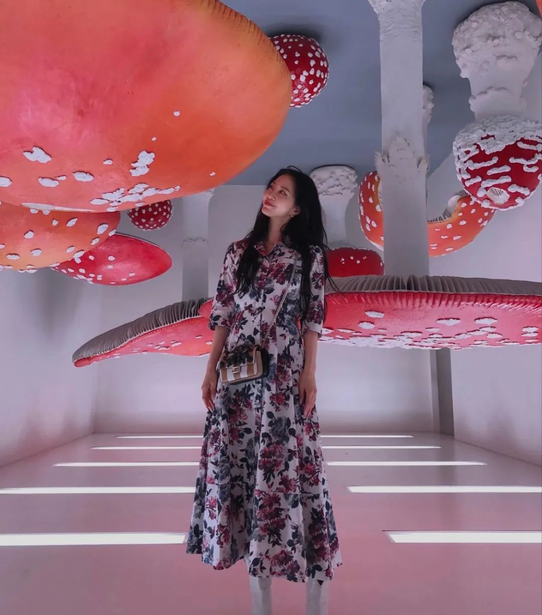 肤色白皙的她很适合穿高饱和度的纯色衣服或者是大印花,突显出明艳动人的味道。