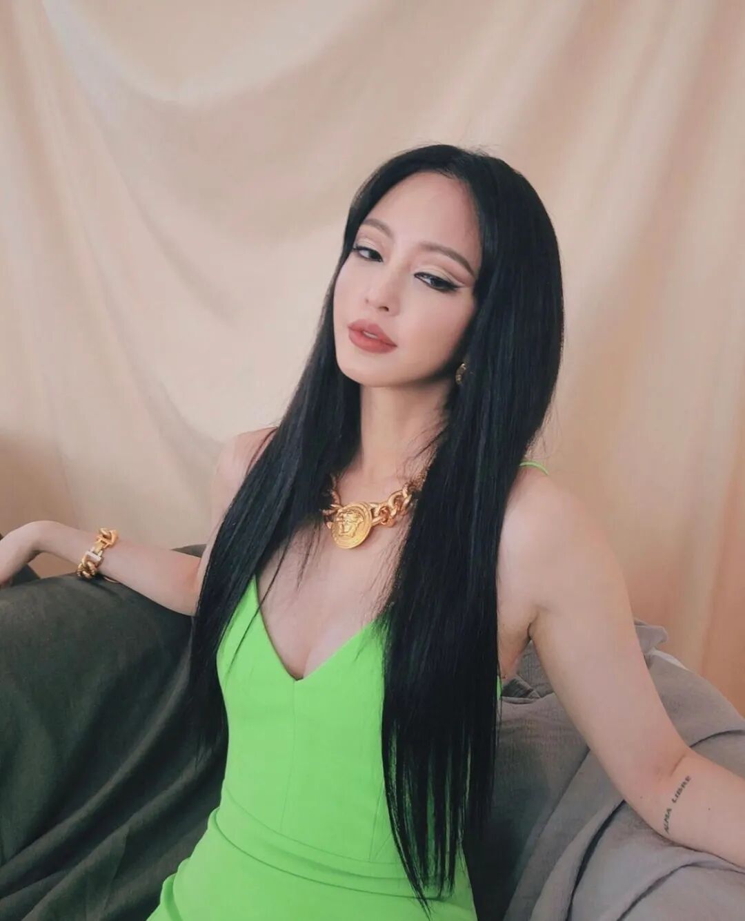如果觉得黑色沉闷,夏季可以选择被绿色填满,像韩艺瑟这件绿色吊带裙,修身性感,风情万种的高冷女神气息隔着屏幕都能感受到,她选择用金色配饰点缀增强高级感,刚柔并济。