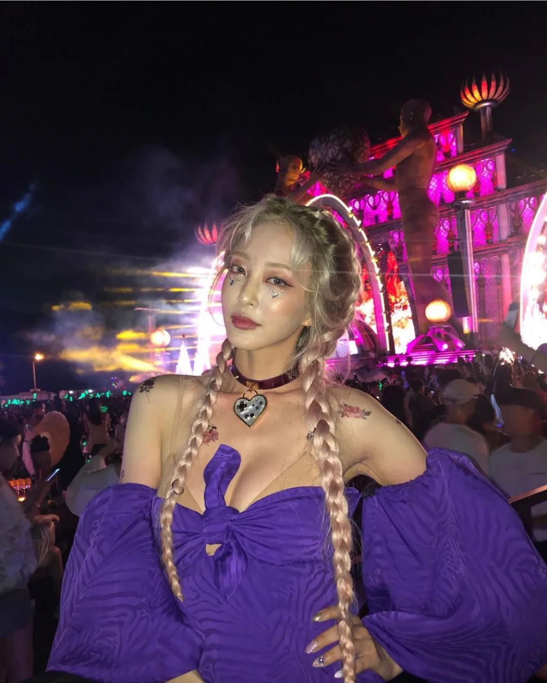 除了吊带,还有清爽迷人的抹胸式Crop Top,最让人印象深刻的就是在音乐节的一套紫色Look。