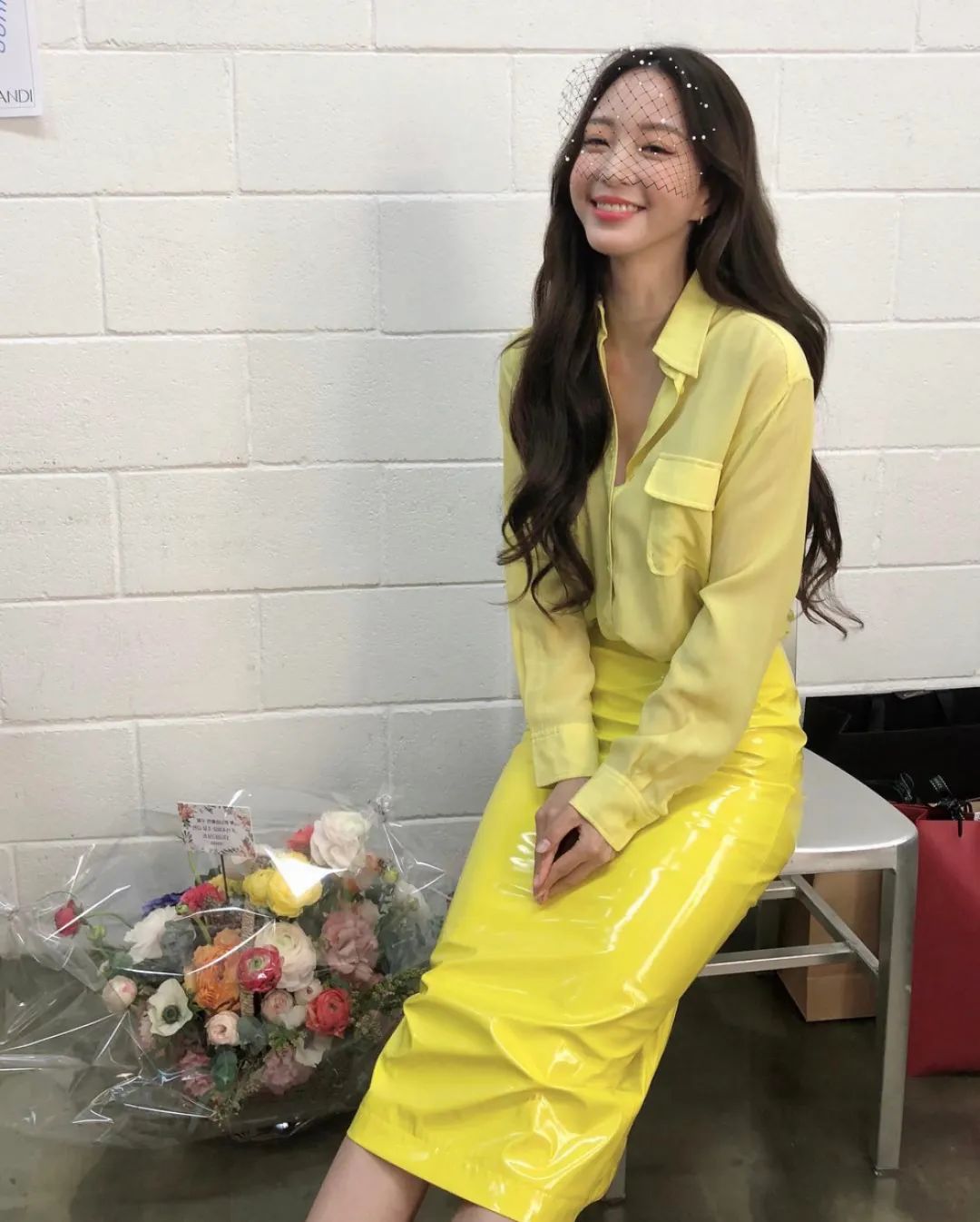 黄色往往可以打破沉闷,韩艺瑟一身亮眼的明黄色格外有活力,衬衫清爽干净,搭配皮裙突显出完美曲线,加上欧尼的笑容温暖治愈,吸睛度max成功抢占视觉焦点。