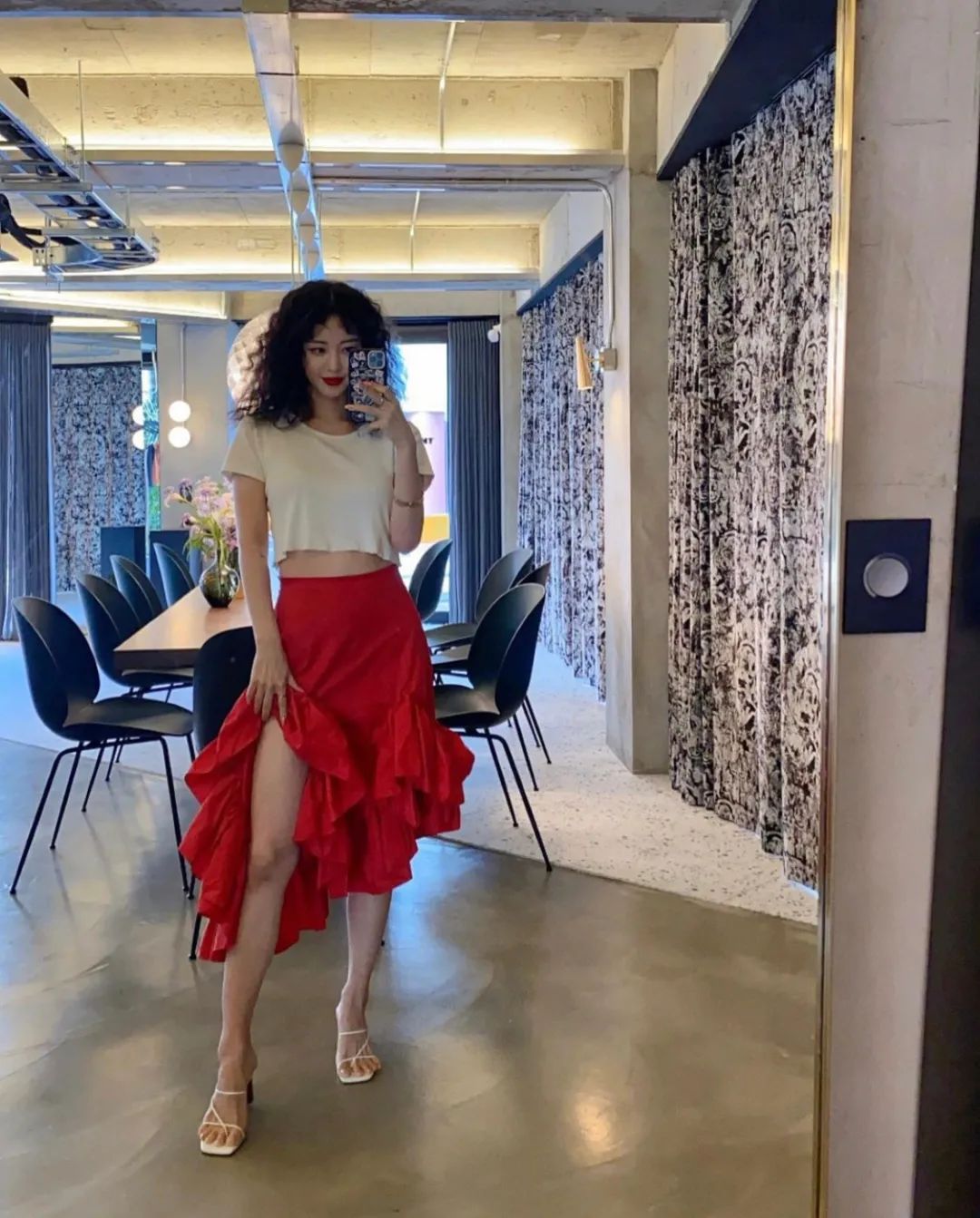 说到明艳当然少不了红色,白色短T配红色半裙性感撩人,裙摆遇上荷叶边,层次感与曲线兼备,配上张扬的大红色,分分钟收获弗朗明哥的热情。