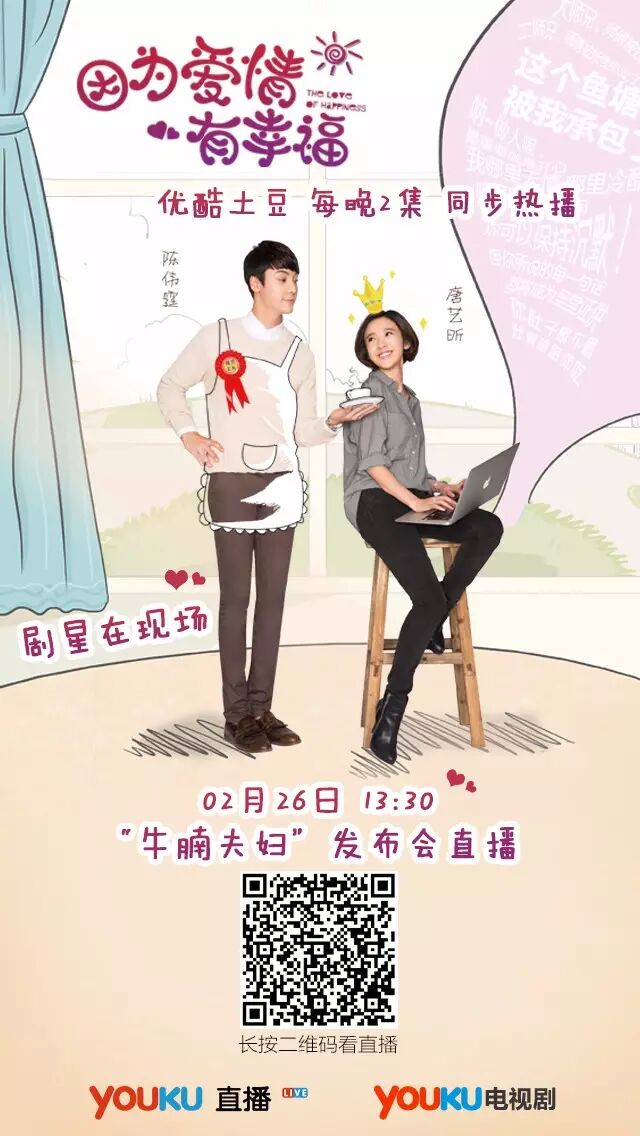 据悉,《因为爱情有幸福》讲述了陈伟霆和唐艺昕这两位“不速之客”来到苏家大院,与这家主人展开三百回合大战,最终创造一段四世同堂其乐融融的奇缘故事。一家三姐妹,一个失散的孩子,一个单亲妈妈,一个过气的歌手……几乎在同一个屋檐下,他们有着各自的故事和烦恼,又在创造着一段段美妙的情缘。延续“因为爱情”前两部的温情和轻喜剧路线,《爱有幸福》既有偶像剧的基本设置,也有贴近生活的细节处理,主角从陌生人到情侣的所有进程都能让观众感到共鸣,可以说是温暖治愈系的“浪漫满屋”。优酷·土豆双平台将与广大网友共同见证幸福之路,全网首播《爱有幸福》,每天2集更新,精彩不容错过。