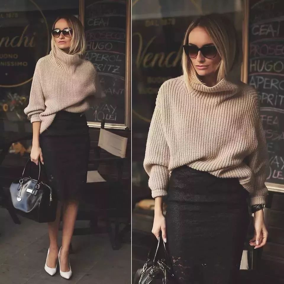 青春和性感最完美的碰撞!宽松毛衣搭配黑色包臀裙,毛衣原来也可以如此优雅~