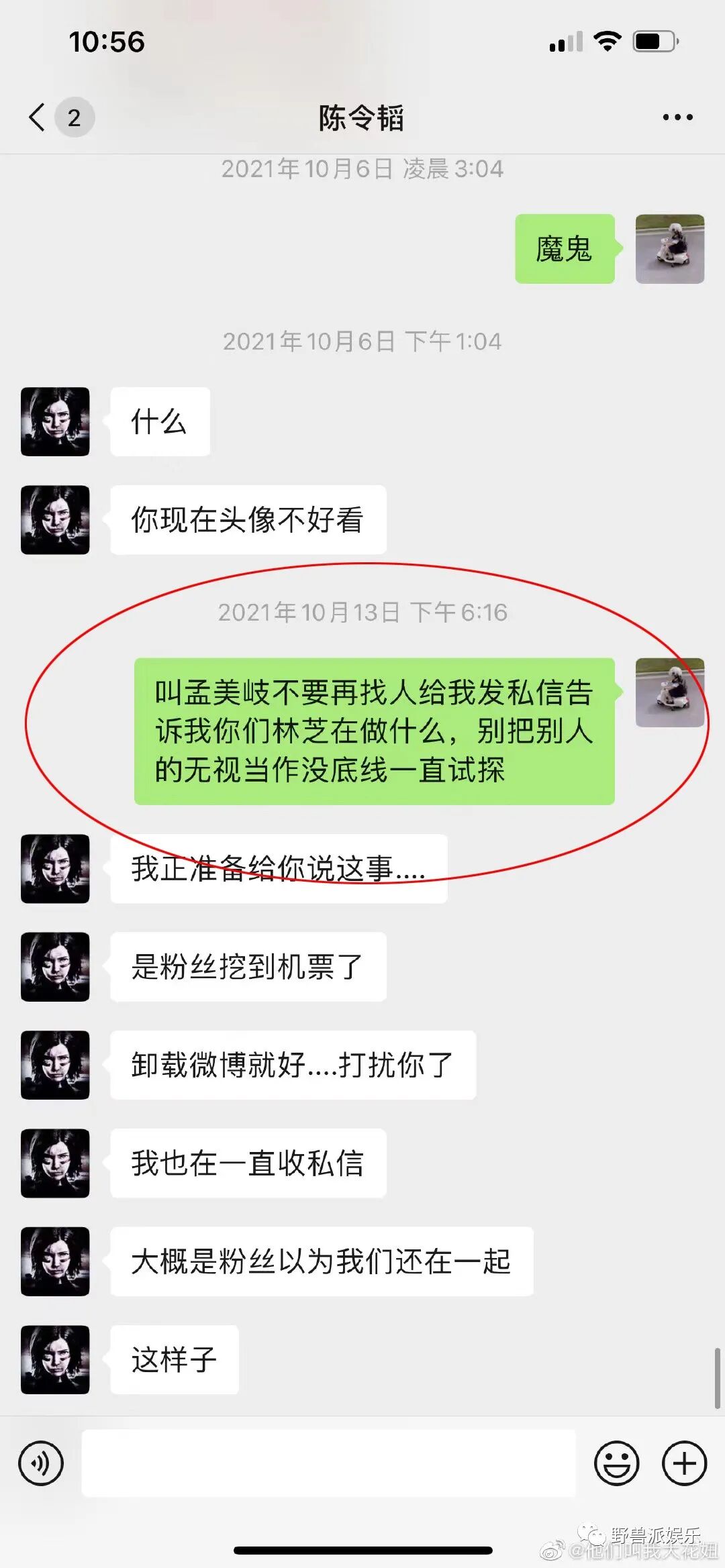 大花妞朋友在今天凌晨放出了一张很锤的聊天记录,在8月3日or8月4日的聊天中,陈令韬表示明确跟孟美岐说过自己有爱的人(大花妞),也就是孟美岐和陈令韬讨论过相关问题,在知道对方有女友的情况下,孟美岐似乎依然选择介入这段感情。