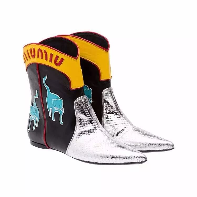 这双短靴采用上光山羊皮和蟒蛇皮德克萨斯风,鞋面装饰的图案是miumiu早期秀场的标志性元素。这款尖头短靴突出少女般的复古风格,是在让人无法抗拒!