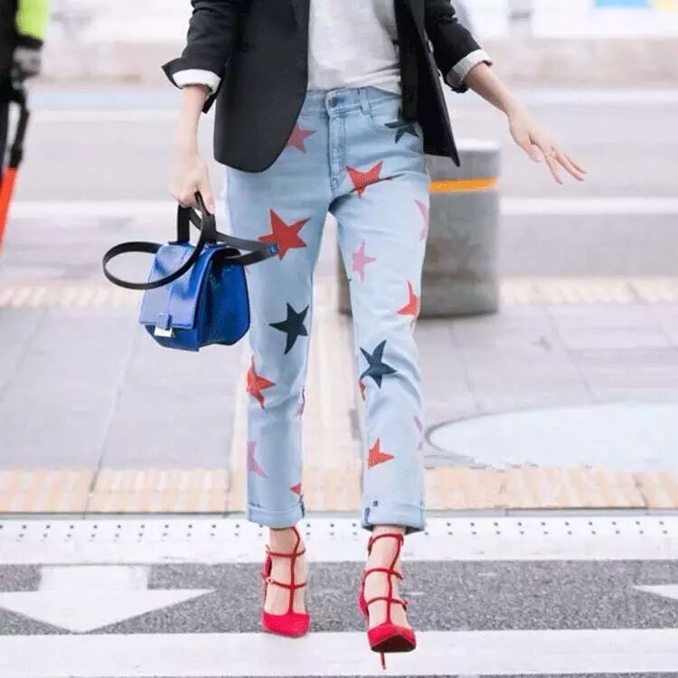 这条星星刺绣牛仔裤,漫不经意中透露着时髦中性风,挽起的裤脚露出纤细的脚踝,完美表达了轻奢的时装态度。而彩色星星的点缀,让单宁风不再单调。