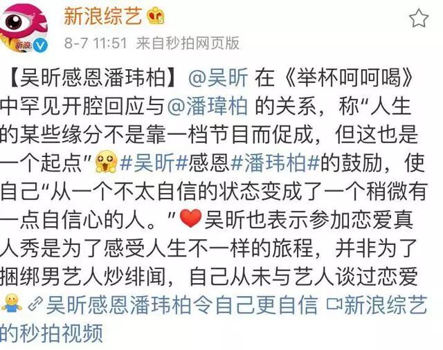 因为吴昕小姐姐在8月6日《举杯呵呵喝》中说了许多心里话,包括“我们相爱吧”她的收获,她的成长,以及遇见的美好。