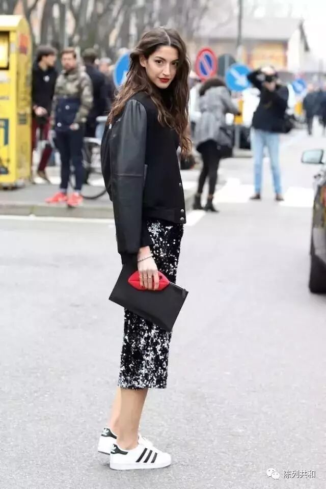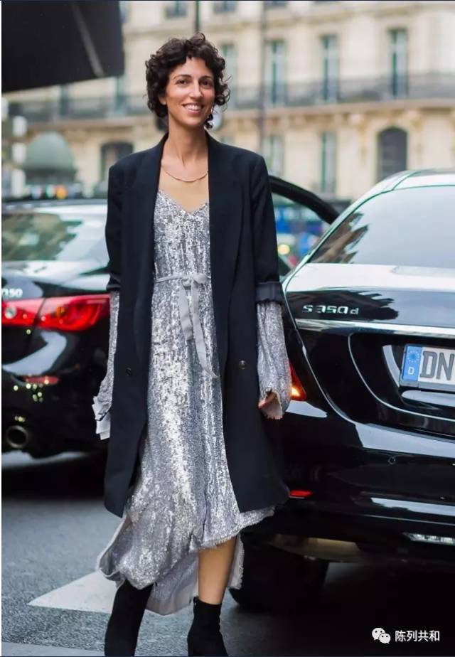 ▼建议选择简约款的外套搭配,和金属色的连衣裙叠穿能获得更加丰富的时尚感。
