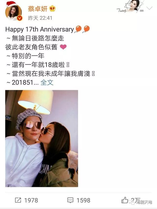 18日晚上,蔡卓妍发文庆祝Twins组合成立17年了,“Happy 17th Anniversary~无论日后路怎么走~彼此老友角色似旧~特别的一年~还有一年就18岁啦~当然现在我未成年让我肤浅~2018.5.18”