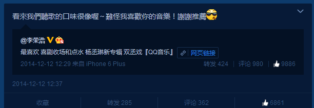 2014年12月12日,李荣浩在微博上表示喜欢杨丞琳的歌,并推荐她的新专辑。而杨丞琳随即回复称:“看来我们听歌的口味很像哦,难怪我喜欢你的音乐!谢谢推荐。”