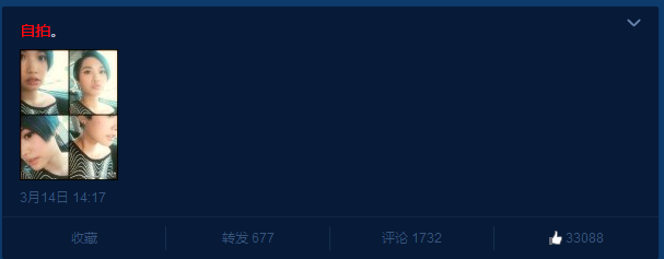 杨丞琳3月14日在微博晒出自拍照,写了“自拍”两字,因《自拍》是她绯闻男友李荣浩的歌,她又选在白色情人节上传,被疑晒爱。