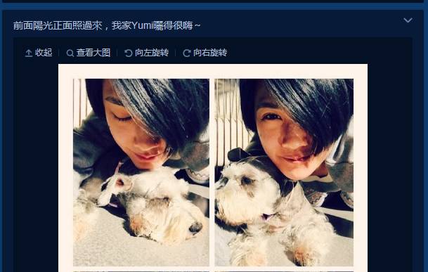 4月15日杨丞琳PO出一张抱着爱犬Yumi的照片,并写下:“前面阳光正面照过来,我家Yumi晒得很嗨~”