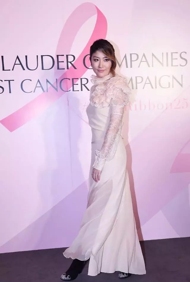 头发全盘起的陈慧琳,一身白色礼服现身,胸口及脖子处蕾丝的修饰,显得脖子有些短。黑色的短靴和整体造型有些格格不入。