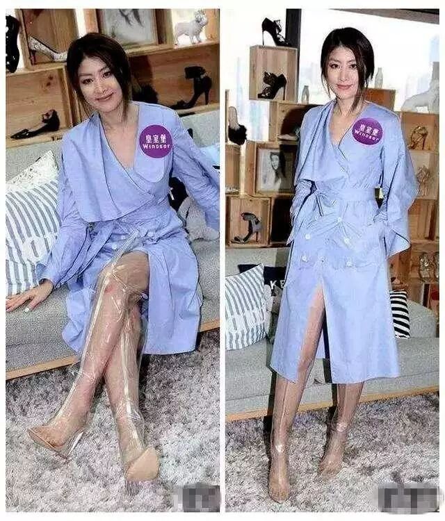 天蓝色风衣显得陈慧琳越发的年轻,风衣开叉的设计,大秀美腿!而这一双塑料高跟鞋非常的抢眼,成为了全场的亮点。