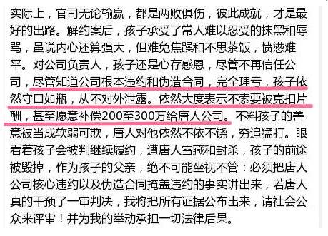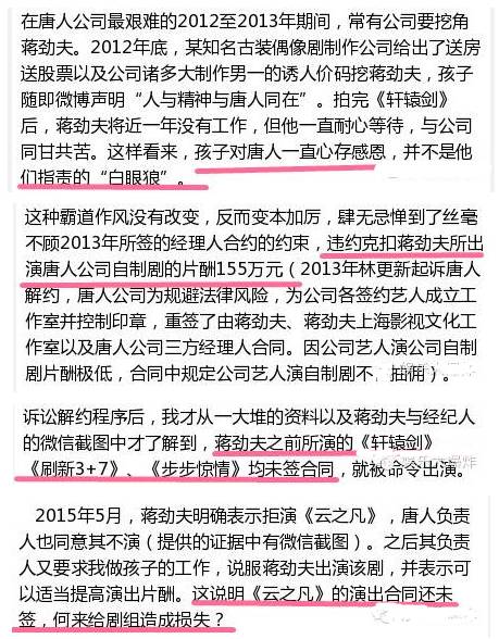 近日蒋劲夫的爸爸开通微博,发长文痛斥唐人,列举其六宗罪。称唐人克扣蒋劲夫片酬155万元,压榨艺人,还指责唐人伪造合同,组织营销号抹黑蒋劲夫,四处活动企图封杀蒋劲夫。原文比较长,截几段吧~~