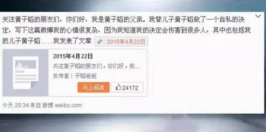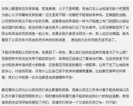 第一时间黄子韬爸爸开通微博,长篇大论表示黄子韬在出道后仅仅三年时间里,身上就留下了大大小小的伤,腰伤、体伤、腿伤不计其数,令父母极为担忧。每次通过微博得知孩子受伤,做父亲的人痛心不已。