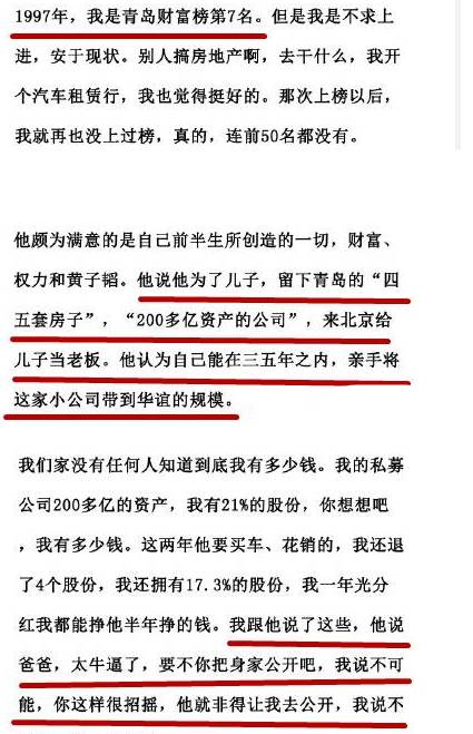黄子韬爸爸接受采访时表示黄子韬让他把身家公开,结果黄子韬爸爸真的公开了。在青岛有四五套房子,而且公司有200多亿的资产,并表示三到五年之内把小公司开到华谊的规模!艾玛!吓死宝宝了!
