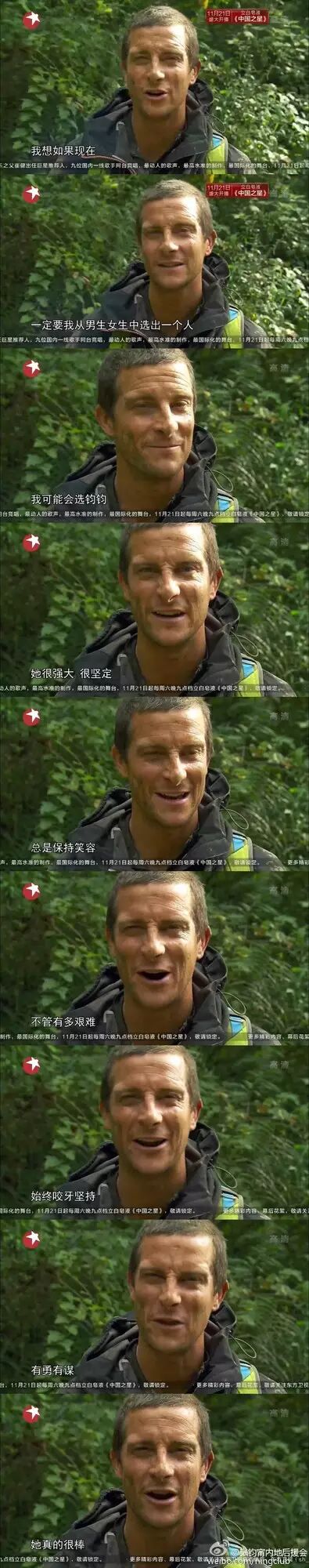 张钧甯作为第一个从十米高空跳入湖中,因为在降落的过程中,由于磕碰导致牙齿出血,但她却依然面带笑容接受采访。在之后的攀岩挑战中,张钧甯更是首当其冲,虽然一开始并不是很顺利,但凭借着多年运动的经验逐渐找到了感觉,第一个成功登顶,给予队友们很大的鼓舞。就连食物链顶端的男人贝尔也为她竖起了大拇指,表示她拥有野外生存者最大的特征—挑战的热情。