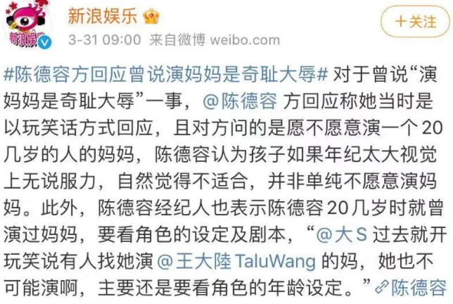 前两天,“陈德容回应曾说演妈是奇耻大辱”话题,突然上了热搜。