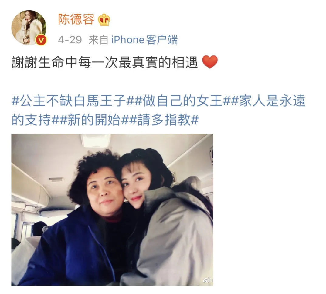 在微博中坦诚“谢谢生命中每一次真实的相遇”,并带上了“公主不缺白马王子”、“做自己的女王”、“新的开始”等话题。