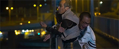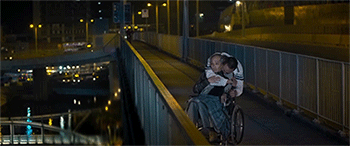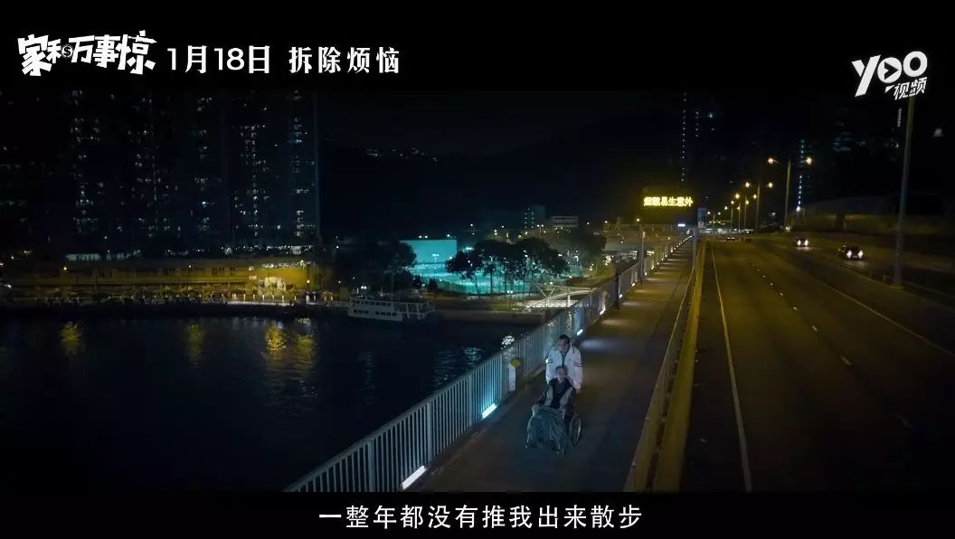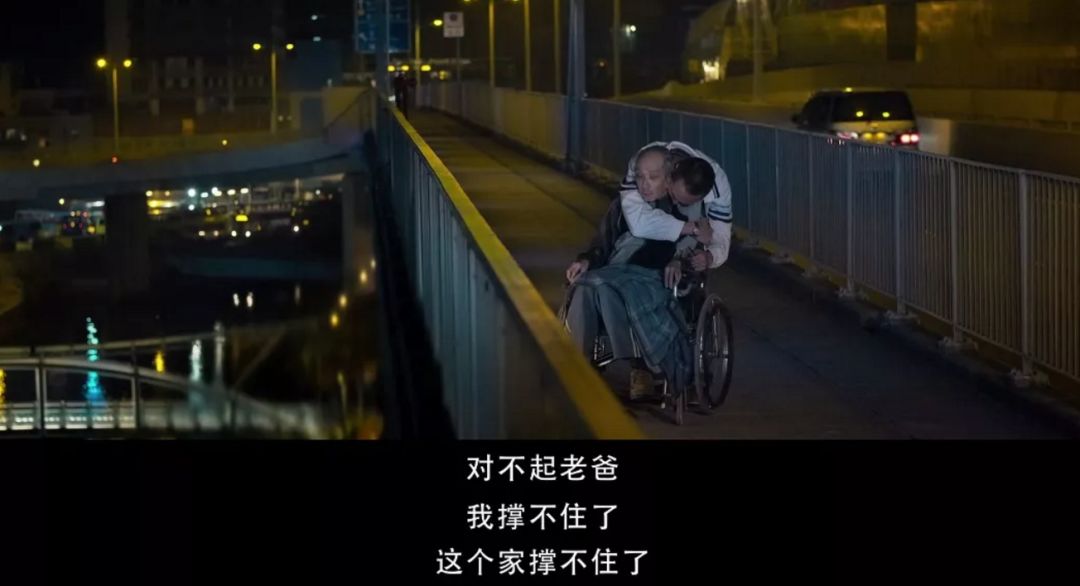 夜幕降临,卢伟文推着年迈的老父(张达明 饰)在桥边散步。