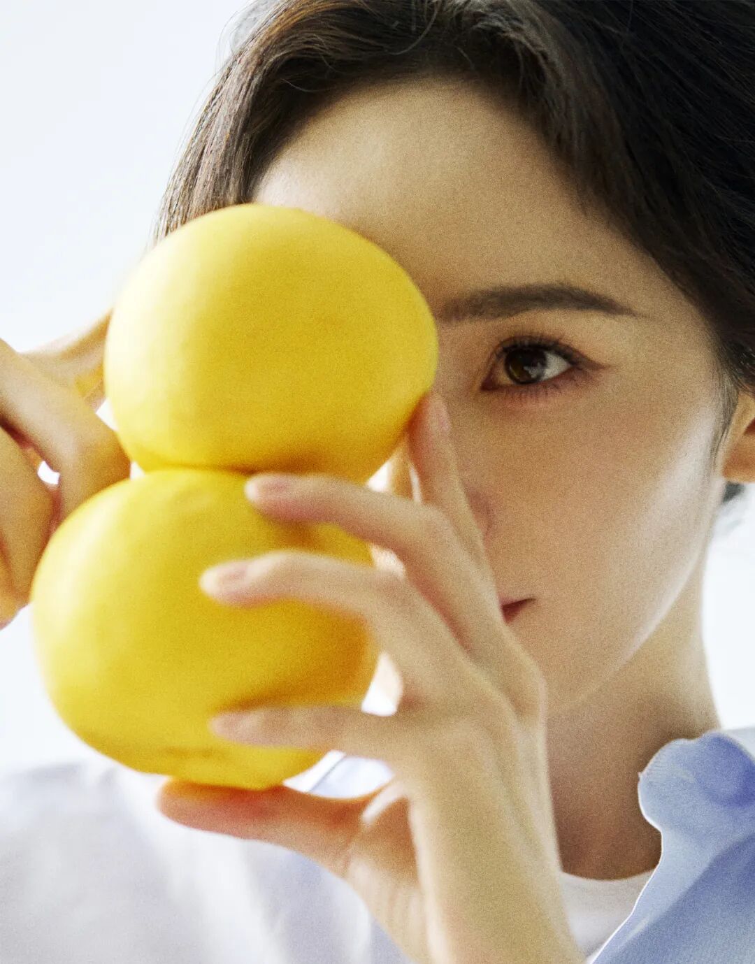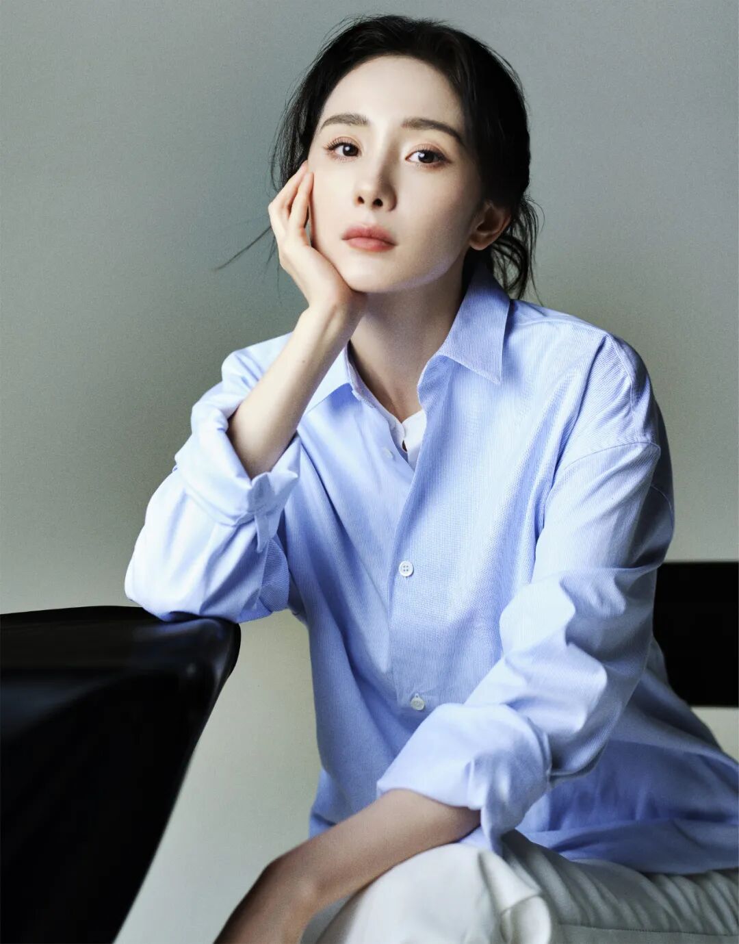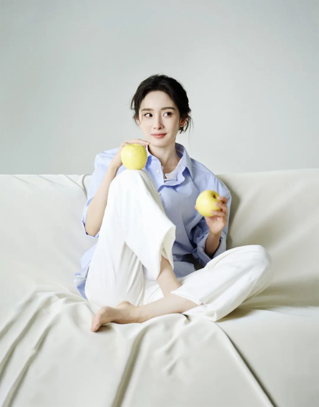 在为《人物》拍摄封面照片时,杨幂为自己选择了很简单、很干净的浅蓝衬衫和白色裤子,和她过去拍摄的杂志封面都不一样。她盘腿坐在素色沙发上,扔着黄色苹果。