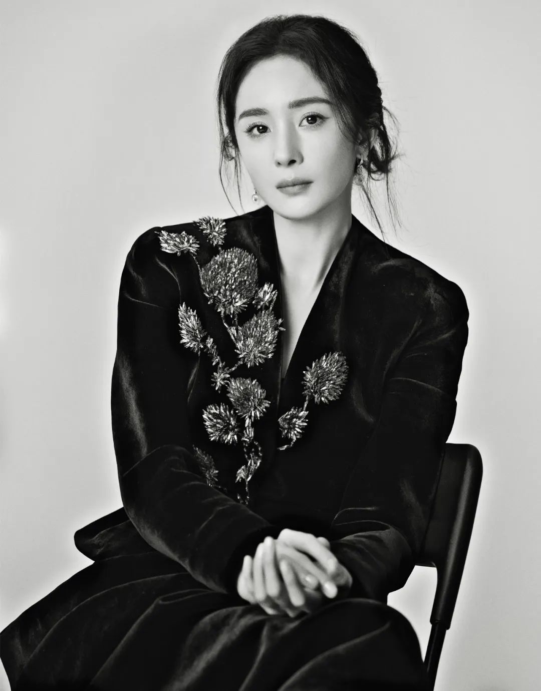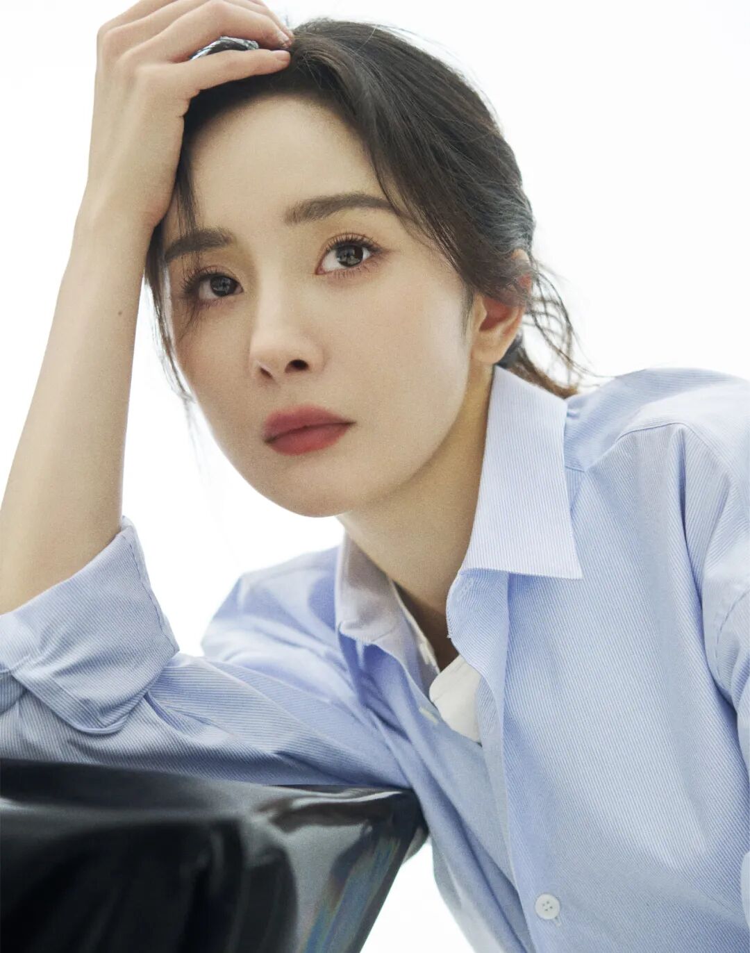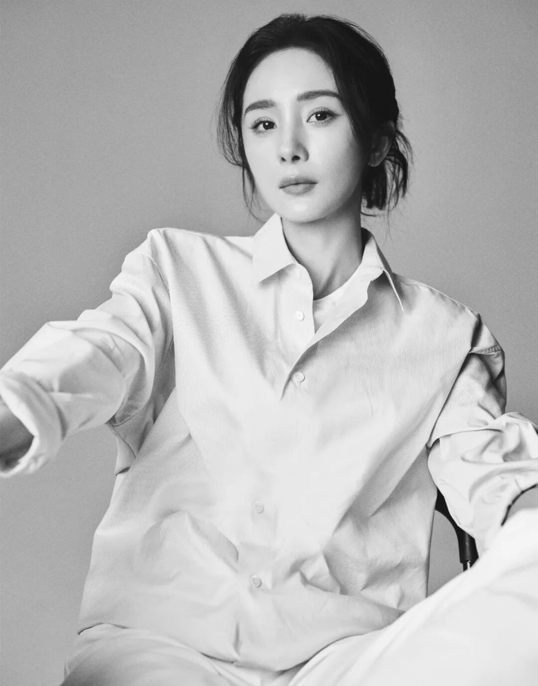 在为《人物》拍摄封面照片时,杨幂为自己选择了很简单、很干净的浅蓝衬衫和白色裤子,和她过去拍摄的杂志封面都不一样。她盘腿坐在素色沙发上,扔着黄色苹果。