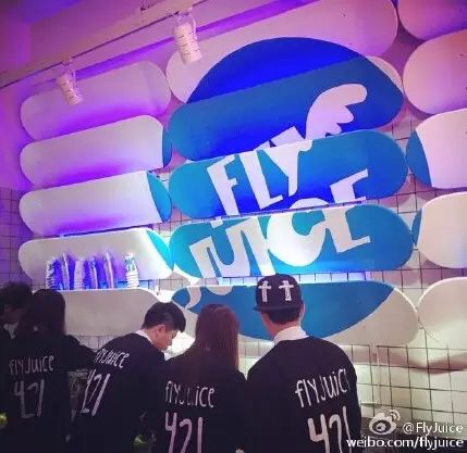 FlyJuice的墙面上贴满了明星艺人、网络红人、潮流达人们和FlyJuice饮品的合影照。目前有上万FlyJuice的粉丝发布了和果汁的合影照片。