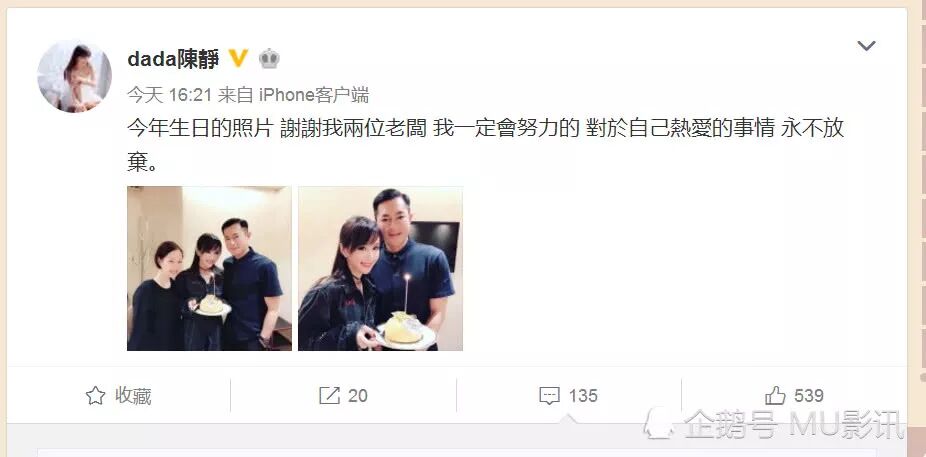 近日,有着“爆炸糖”之称的香港女星陈静在社交网上晒出了两张图片,并写道:今年生日的照片,謝謝我兩位老闆!我一定會努力的,對於自己熱愛的事情,永不放棄。
