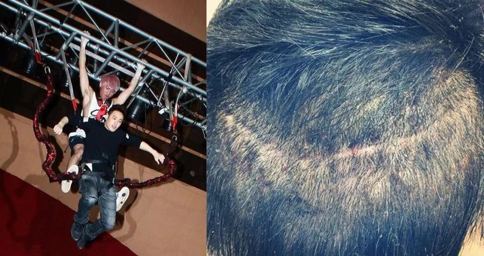 他在表演高空特技时,由于体力不支、重心不稳,不慎摔落舞台,头部大量出血,送医后确诊有17厘米长的伤口,且有脑震荡迹象,经历了两次缝合手术。