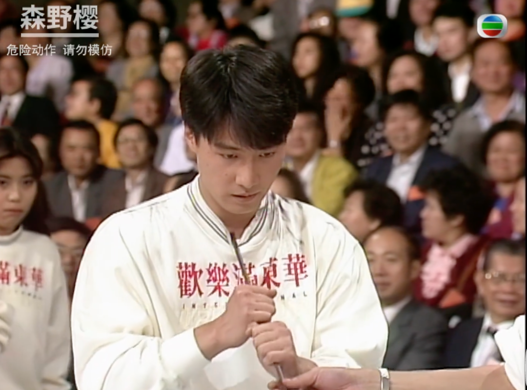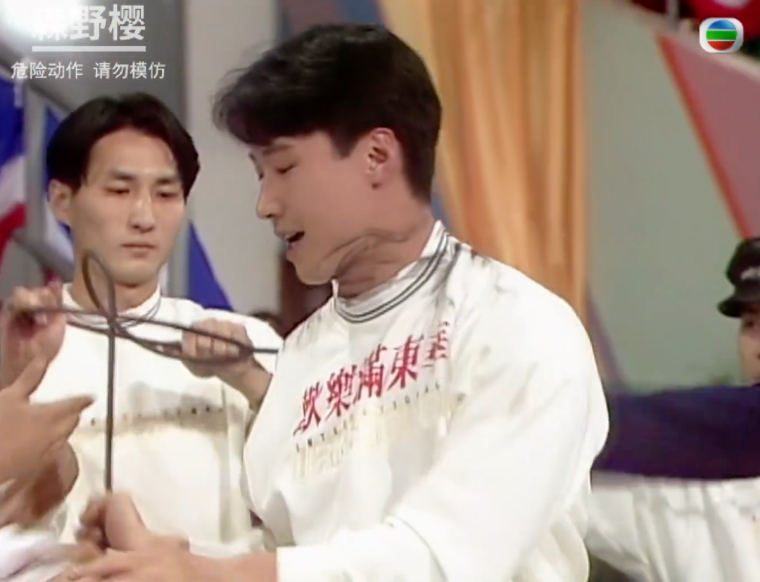 电视台方面清楚这一动作的危险性,当黎明开始做这一动作时,屏幕上陡然出现了大号荧光色的提醒字样,“观众切勿模仿”。