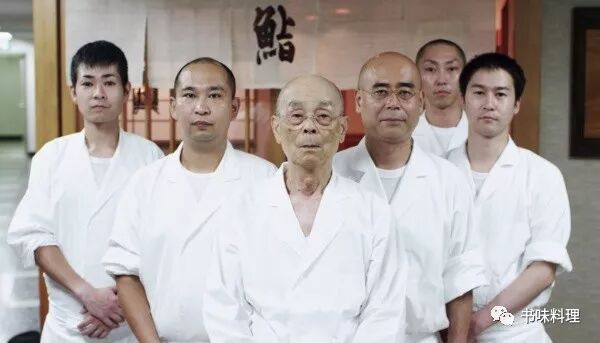 在影片的结尾,有一个场景是数寄屋桥次郎的全体店员面无表情肃立店中,犹如大合影一样的仪式感。就像晓卿老师在《舌尖》里放的一个个“呆照”。只是这里的每个人都不苟言笑,但表情各自生动。恍惚间,我仿佛觉得这画面上的每一个人都神似一种海洋生物——寿而矍铄的海龟、敦厚内敛的鲔鱼,还有鲣鱼、墨乌贼、鲷鱼、鲱鱼、章鱼、海胆、鲽鱼、鲑鱼、比目鱼、文蛤……。这样说绝没有不敬的意思,相反,深受海洋文化的熏陶发展而成的日本是一个崇尚鱼文化的国家。这些顶级寿司艺术家的灵魂里,一定住着一条鱼,他们把它唤出来,在手心里对它膜拜和供奉,跟灵魂握在一起切下来,放在干净雅致的餐盘里。