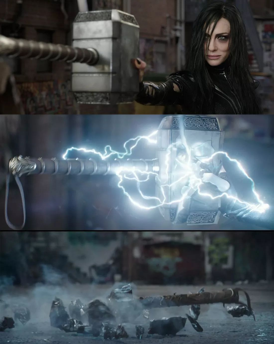 相比雷神在萨卡星的人在囧途,海拉攻陷神域的线相当的孱弱,姐弟之间基本也没有形成什么交流互动,总共就在影片前段与末端打了两场,最拉风的就在出场捏爆了雷神的锤子。雷神不想和姐姐说话,并向姐姐扔了一个锤子,结果有去无回。结合《美国队长2》里美队向冬兵扔盾牌也被接住,可以得出一条漫威世界的定律,不要向有黑眼圈的人扔东西。
