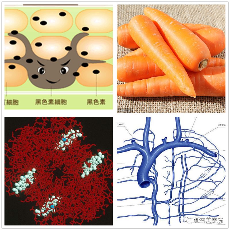 首先,我们要了解一下肤色的形成。皮肤的肤色并不是只有黑色素,其实皮肤里有四种生物色素,分别是:褐色的黑色素、黄色的胡萝卜素与胆色素、红色的氧合血红蛋白和蓝色的还原血红蛋白(脱氧血红蛋白)。其中胡萝卜素为外源性色素,不能由人体自身合成,其他三种都为内源性色素,均由机体自身合成。