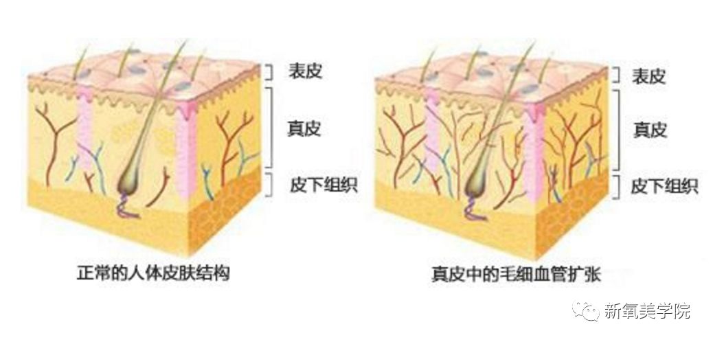 大部分人的皮下毛细血管是左边这样,红脸蛋的毛细血管是右边这样。